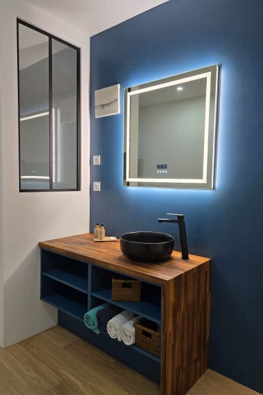 Création d'une chambre avec sa salle de bain, séparé par un châssis façon atelier vitré du commerce, realisation du placostil par nos soins et finition peinture.