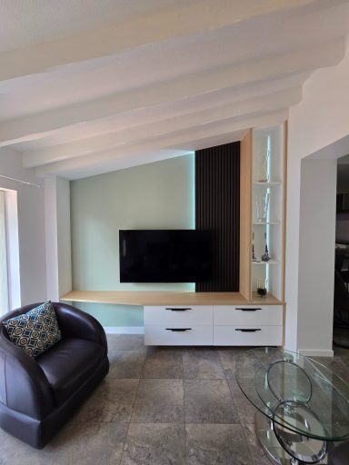 Réalisation d'un aménagement complet d'un salon espace télévision, conception suivant projet et plans d'ADDICT STUDIO, travaux de curage - placo - préparation - peinture- fabrication dans nos ateliers - et finition par Créat 'Oak. Localisation le BOULOU